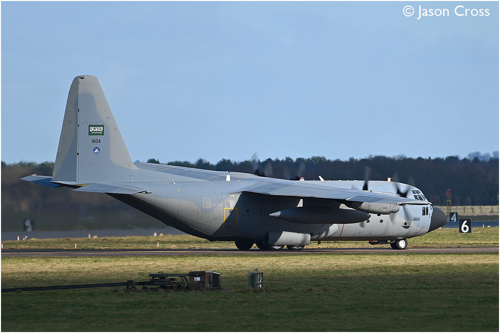 An unusual visitor at RAF Coningsby as Royal Saudi Arabian Air Force Lockheed Hercules C130H 1604 arrives from Heraklion (Crete). Date: 26 February 2023 Manipulation Notes: None