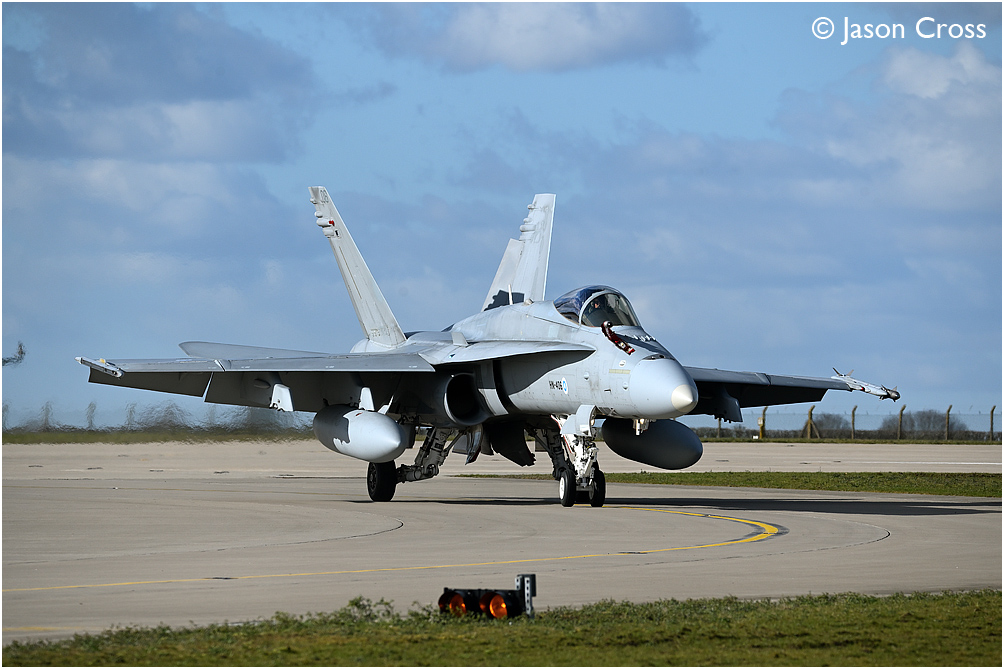 Finland Air Force F18 Hornet HN406 taxiing in after arriving back at RAF Waddington from a sortie. Exercise Cobra Warrior. Date: 10 March 2023 Manipulation Notes: None