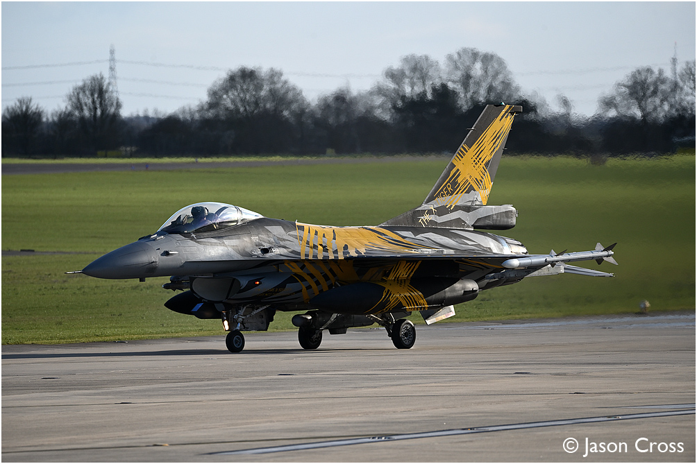 Belgian Air Force F16 FA136 'Tiger X' taxiing to stand after landing at RAF Waddington. Exercise Cobra Warrior. Date: 10 March 2023 Manipulation Notes: None