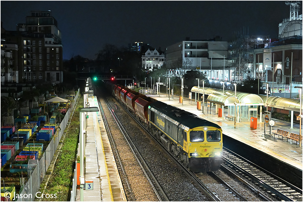 66597 passing through Kensington Olympia with the 7M17 2005 Tolworth to Wembley Reception Sidings 1-7 stone empties. Date: 15 March 2023 Manipulation Notes: None