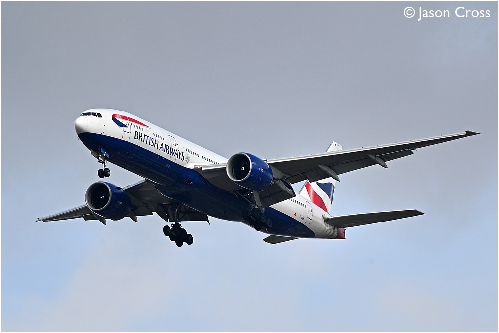 British Airways Boeing 777 G-VIIN over Hounslow while on final approach to Heathrow 27R with a flight from Abuja (Nigeria). Date: 16 March 2023 Manipulation Notes: None