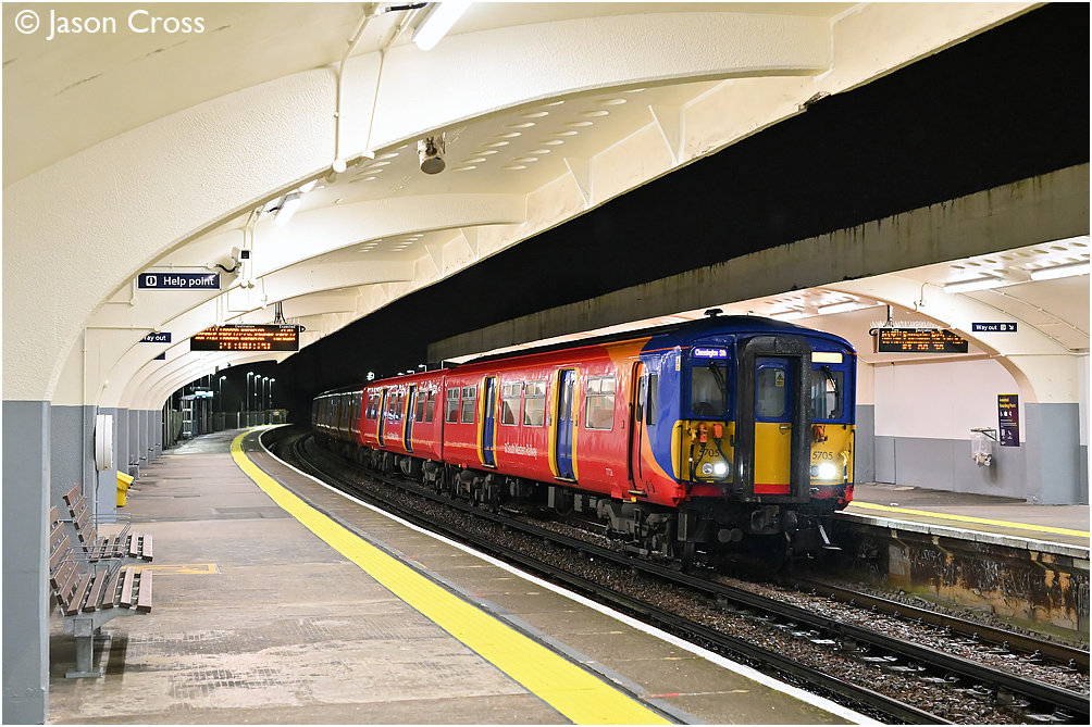 5705 and 5920 arrive at Malden Manor with 2M68 2104 London Waterloo to Chessington South. Date: 20 March 2023 Manipulation Notes: None