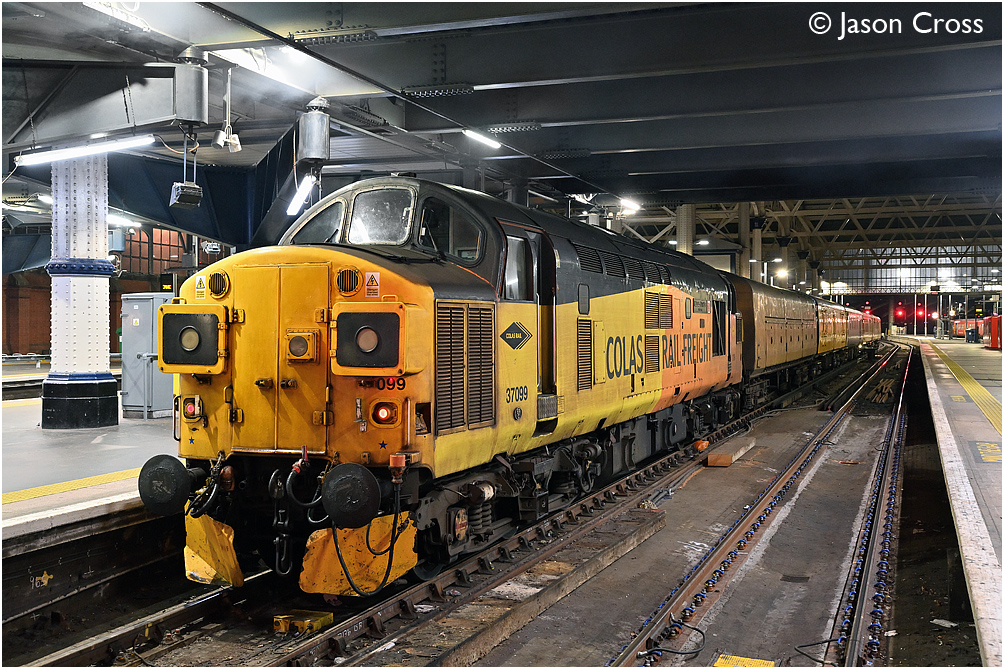 37099 on the blocks at London Waterloo with a 3Q09 2204 Woking Up Yard Reception to London Waterloo test train. Date: 20 March 2023 Manipulation Notes: None