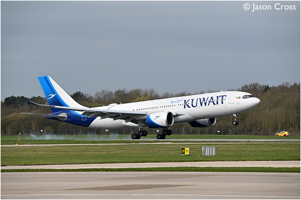 Kuwait Airways Airbus A330 9K-APH touches down on runway 05L with a flight from Kuwait City. Manchester Airport. Date: 2 April 2023 Manipulation Notes: None
