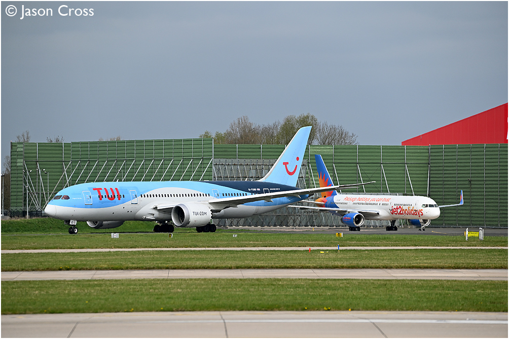 TUI Boeing 787 G-TUID taxiing to runway 05L prior to departing for Montego Bay. Manchester Airport. Date: 2 April 2023 Manipulation Notes: None