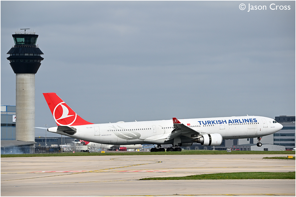 Turkish Airlines Airbus A330 TC-JOD landing with a flight from Istanbul. Manchester Airport. Date: 2 April 2023 Manipulation Notes: None