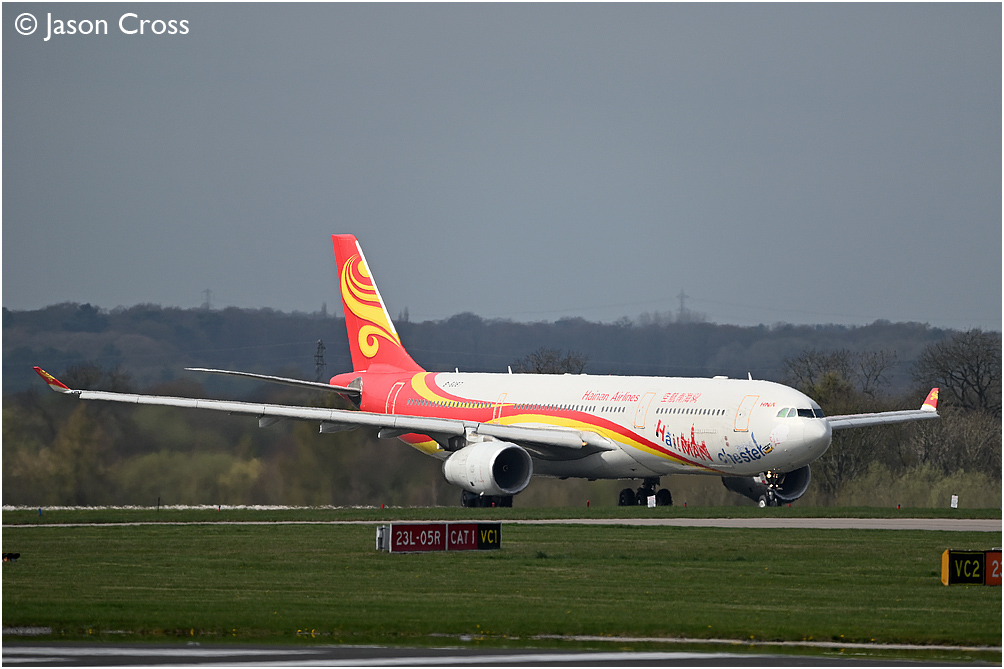 Hainan Airlines Airbus A330 B-8287 departing to Beijing. Manchester Airport. Date: 2 April 2023 Manipulation Notes: None