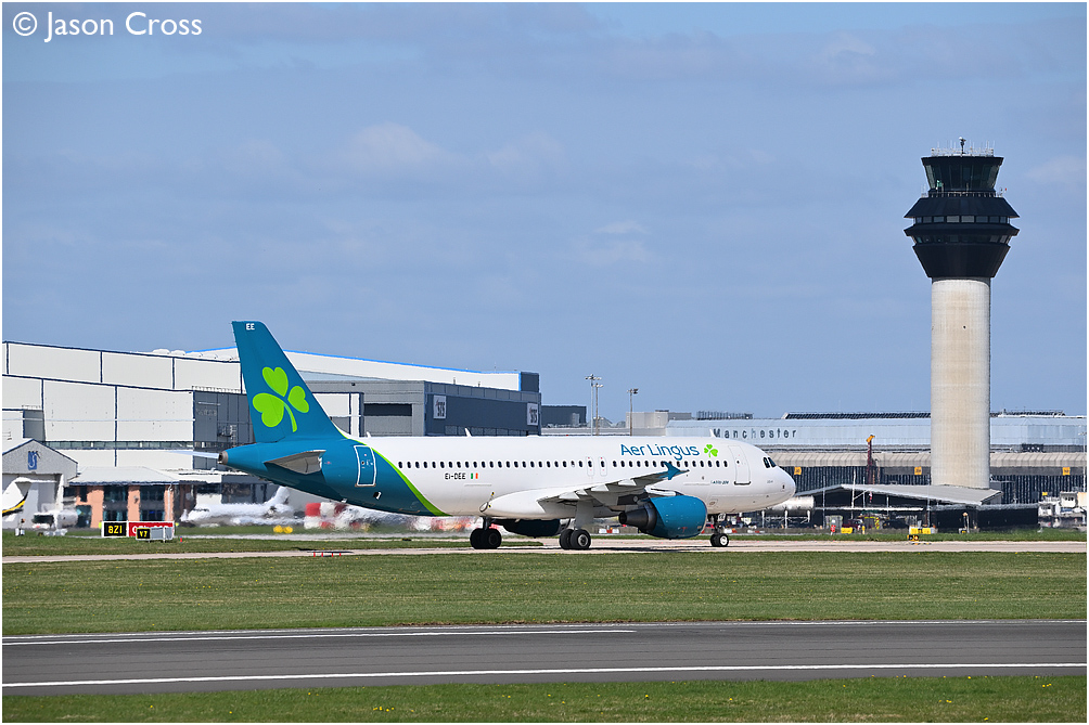 Aer Lingus Airbus A320 EI-DEE taxiing in after landing on runway 05R with a flight from Dublin. Manchester Airport. Date: 2 April 2023 Manipulation Notes: None