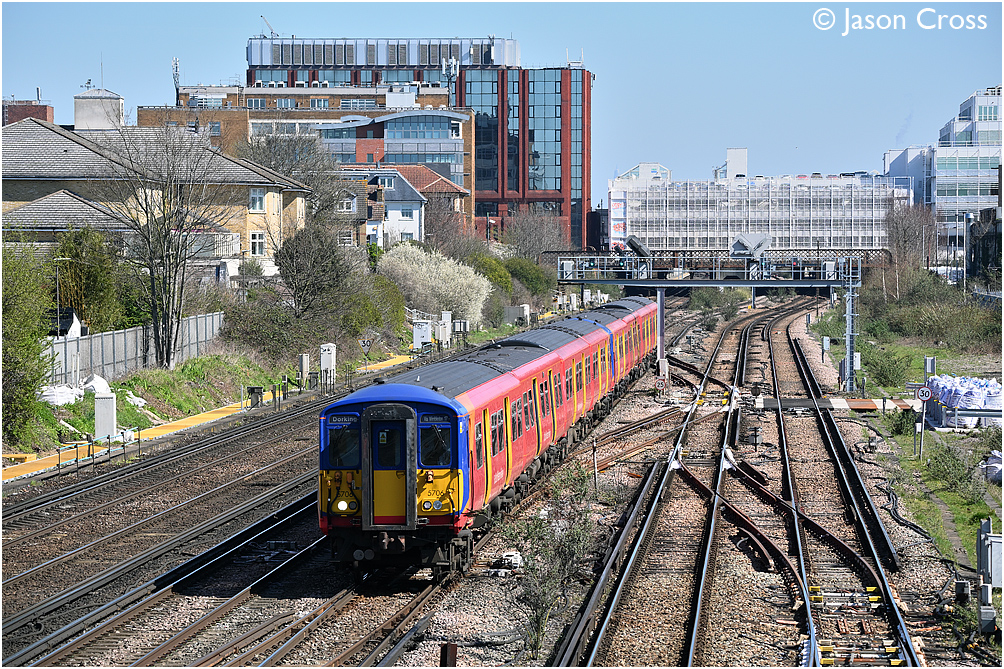 5706 and 5723 power away from their Wimbledon stop with the 1D25 1124 London Waterloo to Dorking. Date: 4 April 2023 Manipulation Notes: None