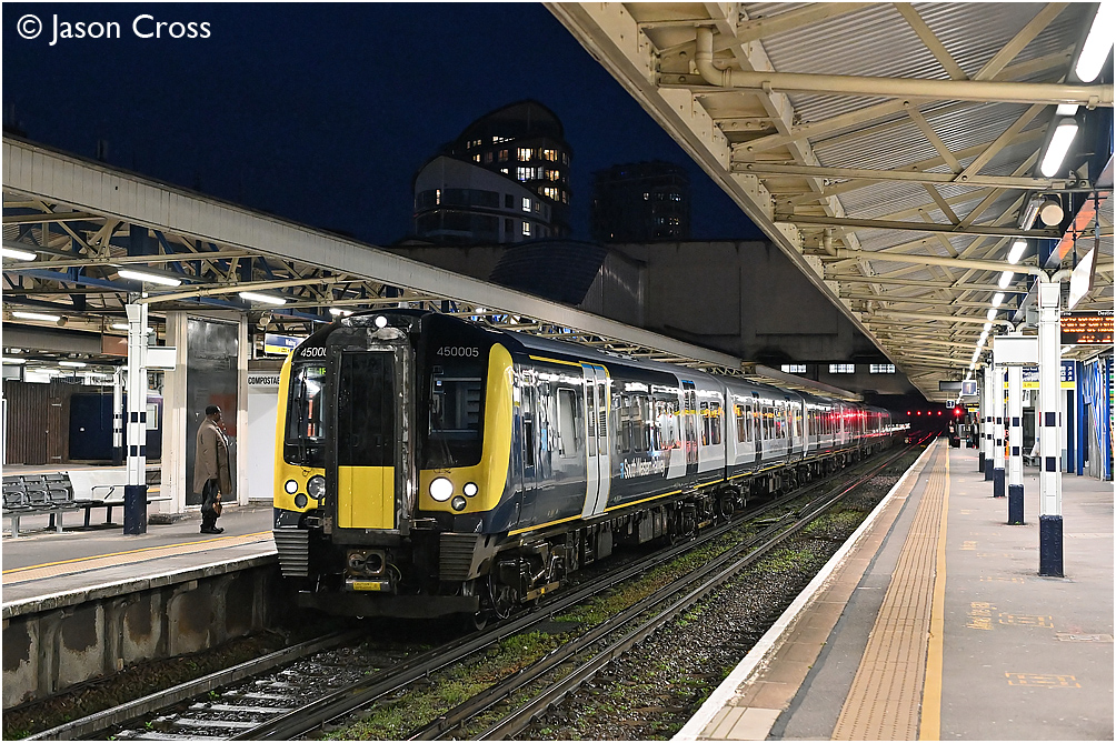 450005 and 444006 arrive at Woking with the 1W30 1803 Weymouth to London Waterloo. Date: 12 April 2023 Manipulation Notes: None