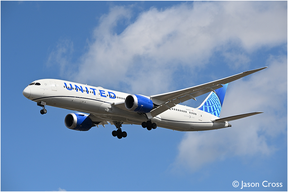 United Airlines Boeing 787 N29975. Flight UAL923, 1710 Los Angeles to London Heathrow. London Heathrow Airport approach to runway 27R. Date: 13 April 2023 Manipulation Notes: None