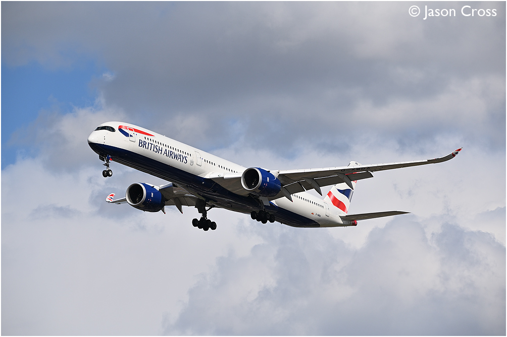 British Airways Airbus A350 G-XWBA. Flight BA272, 1900 San Diego to London Heathrow. London Heathrow Airport approach to runway 27R. Date: 13 April 2023 Manipulation Notes: None