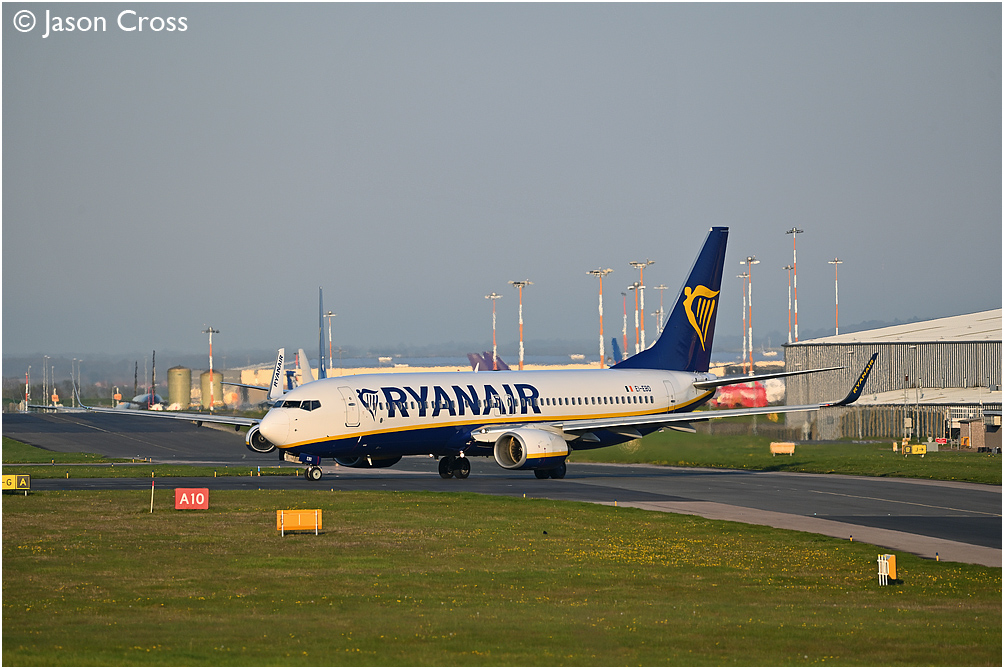 Ryanair Boeing 737 EI-EBD. Flight RYR34UA, 1855 East Midlands Airport to Alicante. East Midlands Airport, taxiing to runway 09 for take off. Date: 17 April 2023 Manipulation Notes: None