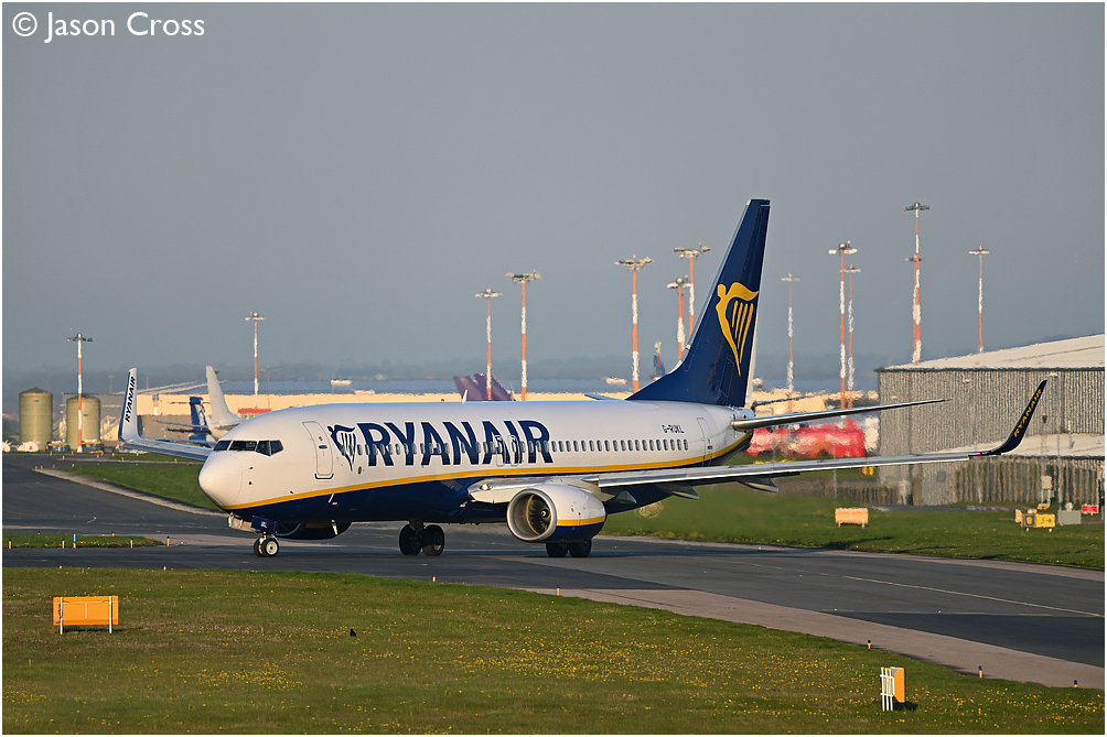 Ryanair Boeing 737 G-RUKL. Flight RUK9606, 1850 East Midlands Airport to Belfast. East Midlands Airport, taxiing to runway 09 for take off. Date: 17 April 2023 Manipulation Notes: None
