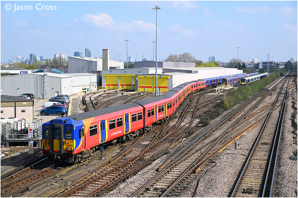 Class 455s 5851 and 5868 are captured during a shunt move within Wimbledon Traincare Depot. Date: 18 April 2023 Manipulation Notes: None