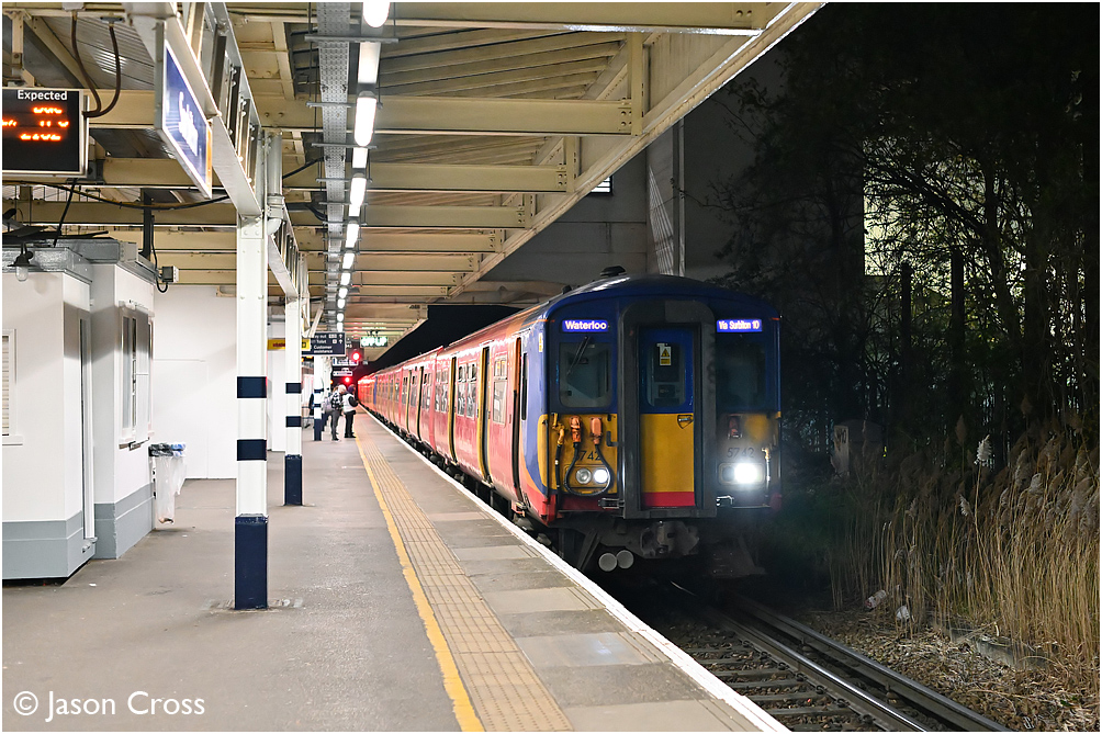 5742+5711 call at Surbiton with 2F68 2103 Woking to London Waterloo. Date: 18 April 2023 Manipulation Notes: None