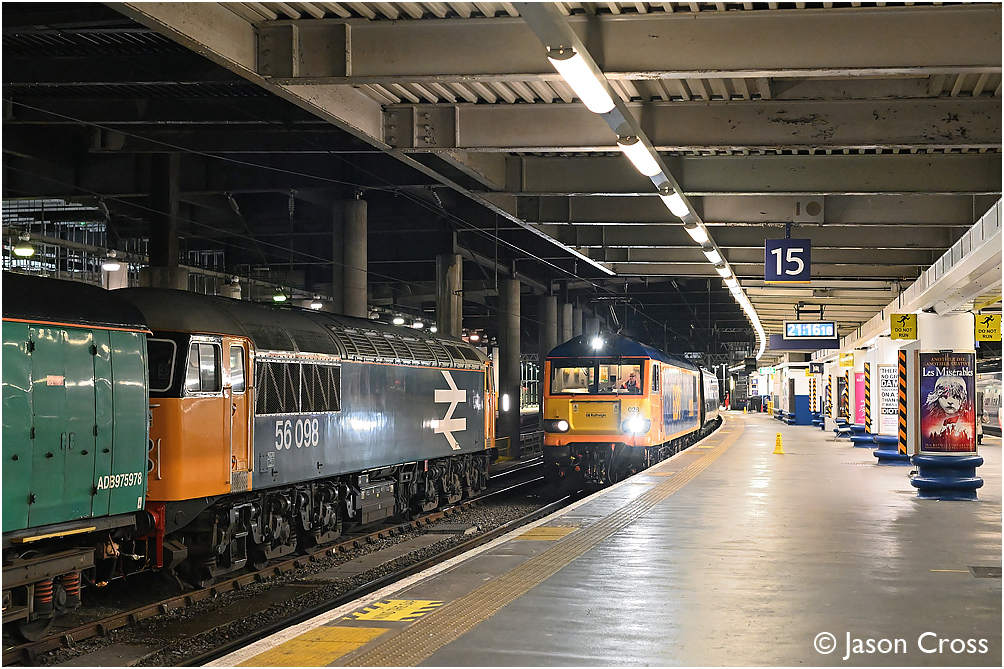 92028 arrives in Euston's platform 15 with the 5S96 Caledonian Sleeper ECS from Wembley, while 56098 is seen stabled alongside with a set of barrier vehicles (and 50007 on the opposite end). Date: 24 April 2023 Manipulation Notes: None