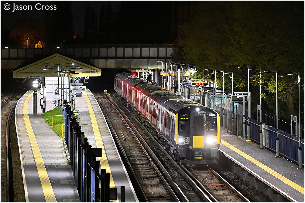 450006 and 450094 slow to a stand at Barnes with the 2S68 2033 Weybridge to London Waterloo service. Date: 25 April 2023 Manipulation Notes: None
