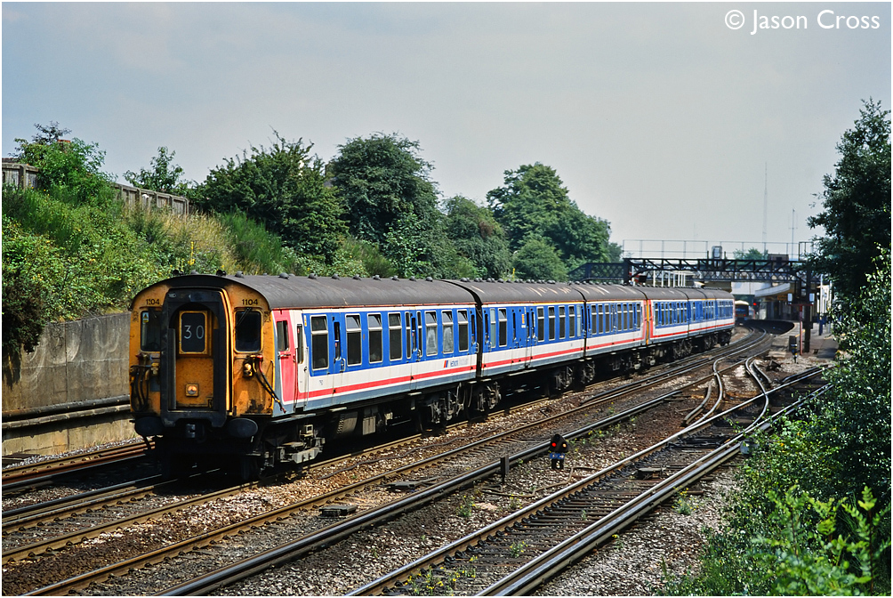 Class 411 units 1104 and 1108 pass through Swanley with an up service. Date: 10 July 1999 Manipulation Notes: None