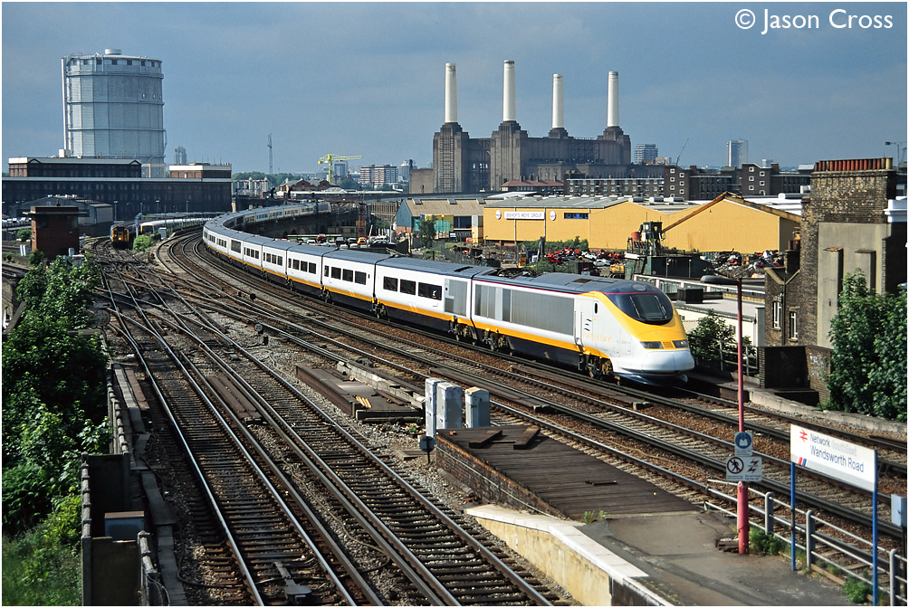 Eurostar 3206 passes Wandsworth Road with train 9148, the 1627 London Waterloo to Brussels. Date: 1 June 1995 Manipulation Notes: None