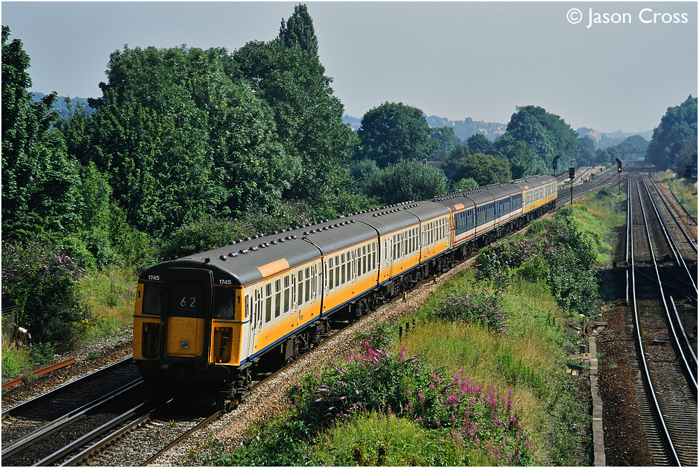 A 12-car formation of 4-CIG units 1745, 1753 and 1863 pass Coulsdon North with a down service. Date: 10 July 1999 Manipulation Notes: None