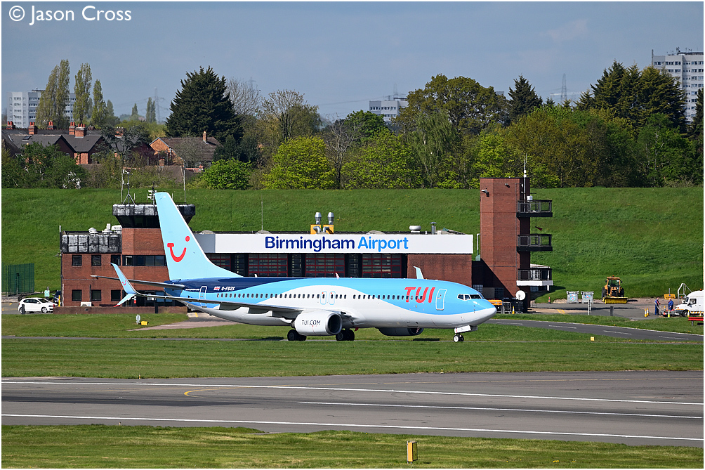 TUI Boeing 737 G-FDZS taxiing to stand after arriving from Dalaman. Birmingham Airport. Date: 1 May 2023 Manipulation Notes: None
