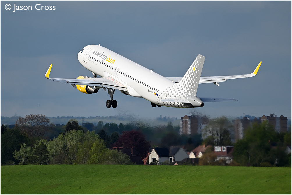 Vueling Airbus A320 EC-MAN departing to Barcelona. Birmingham Airport. Date: 1 May 2023 Manipulation Notes: None