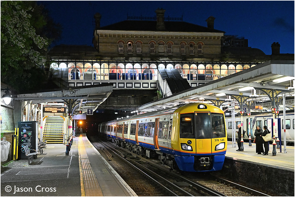 378145 arrives at Denmark Hill with the 9H64 2115 Clapham Junction to Dalston Junction London Overground service. Date: 4 May 2023 Manipulation Notes: None