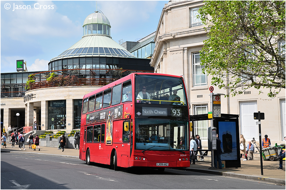 DOE49 outside the Centre Court shopping Centre in Wimbledon with a 93 service from Putney Bridge to North Cheam. Date: 18 May 2023 Manipulation Notes: None