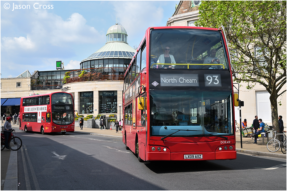 DOE49 outside the Centre Court shopping Centre in Wimbledon with a 93 service from Putney Bridge to North Cheam. In the background, WVN39 is pulling up with a 131 service for Ealing Broadway. Date: 18 May 2023 Manipulation Notes: None