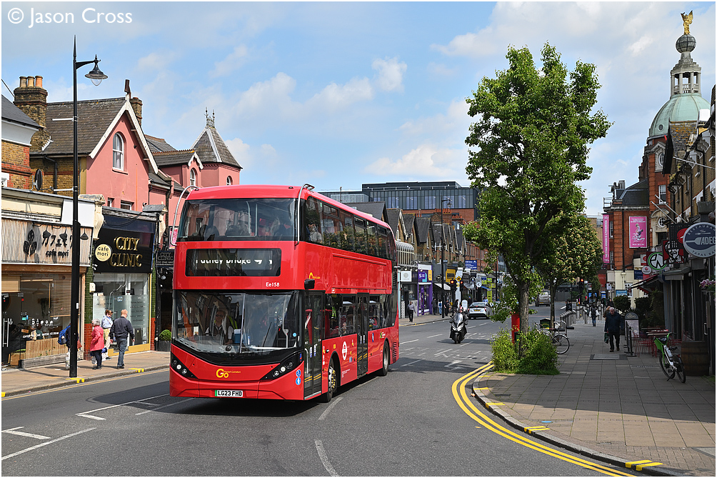 Ee158 on The Broadway in Wimbledon with a 93 service from North Cheam to Putney Bridge. Date: 18 May 2023 Manipulation Notes: None