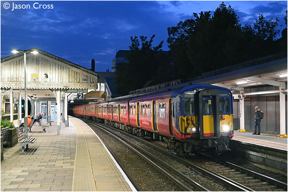 5912 and 5708 slow for their Putney stop while working 2K61 2027 London Waterloo to London Waterloo. Date: 18 May 2023 Manipulation Notes: None