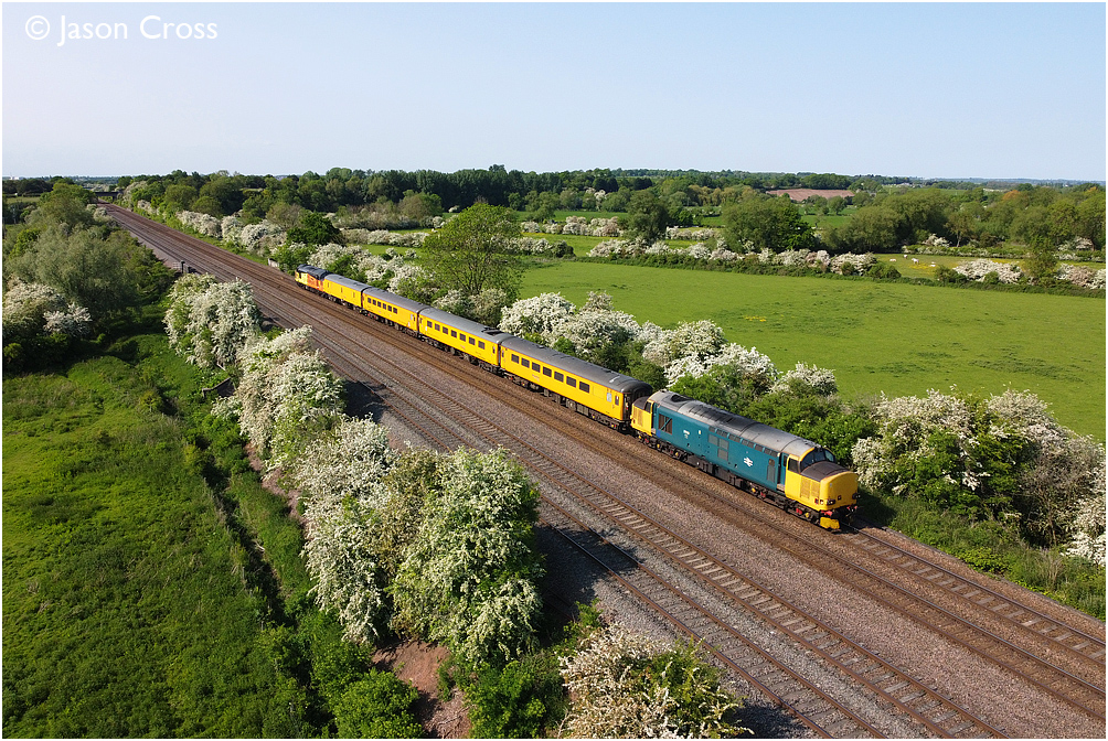 37610 (with 37254) approaching Syston North Junction with a 1Q90 1515 Derby RTC to Ferme Park Reception Sidings test train. Date: 22 May 2023 Manipulation Notes: None Photo taken from a drone