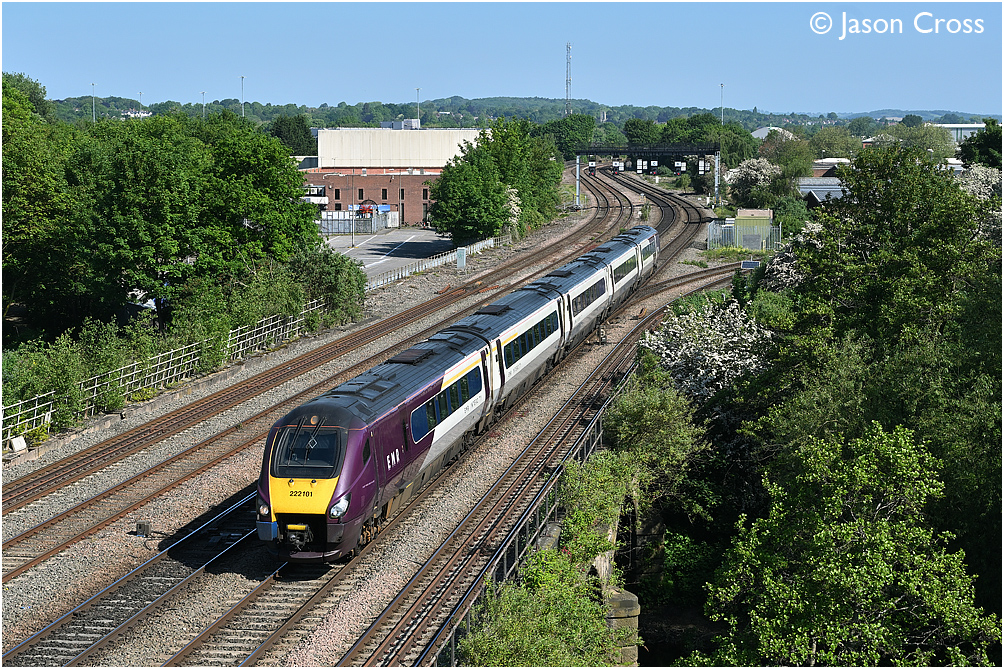 222101 crosses the River Derwent on the approach to Derby while working the 1C29 0900 Sheffield to St Pancras International. Date: 24 May 2023 Manipulation Notes: None