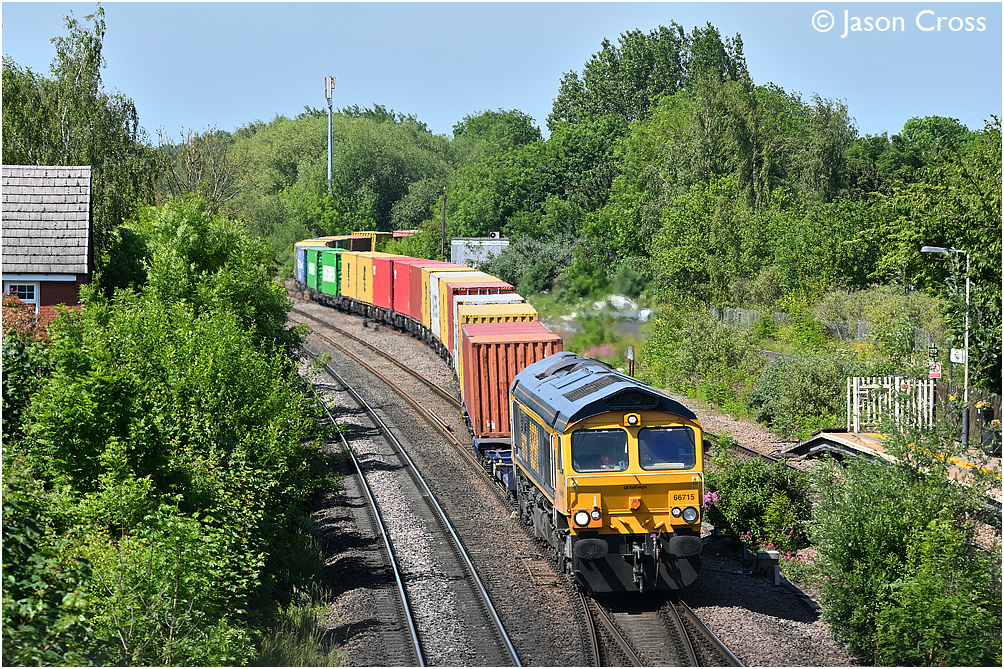 66715 'Valour' negotiates Syston South Junction with the 4M33 Felixstowe North to Hams Hall container train. Date: 8 June 2023 Manipulation Notes: None