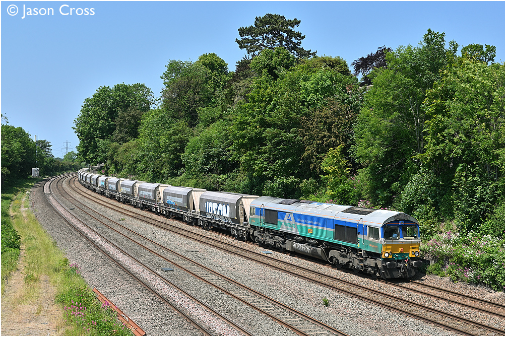 66711 'Sense' passes Barrow-upon-Soar at the head of the 6M01 1051 Tinsley Yard to Bardon Hill stone empties. Date: 9 June 2023 Manipulation Notes: None