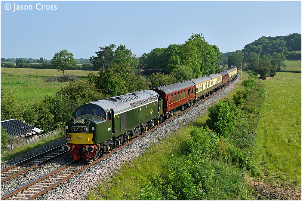 Class 40 D345 passes Oddingley with a 1Z40 0701 Burton upon Trent to Weymouth railtour. Date: 10 June 2023 Manipulation Notes: None Camera mounted on a tall pole and remotely fired