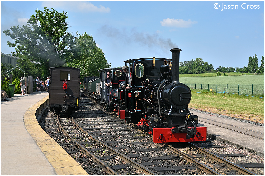 Barclay (works no.1991 of 1931) 'Cegin' and Avonside (works no.2067 of 1933) 'Marchlyn' passing Strawberry Park Halt. Statfold Barn Railway - Summer Spectacle of Steam event. Date: 11 June 2023 Manipulation Notes: None