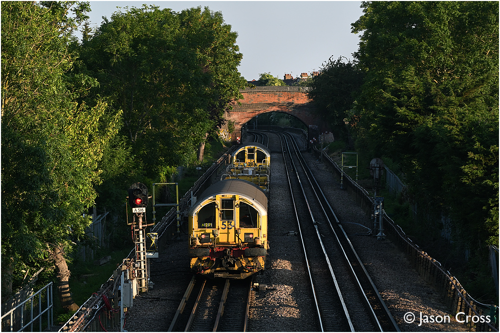 L28 leads L53 away from Sudbury Town with train 627, an 0420 Victoria No.23 Siding to Ruislip Depot engineering train. Date: 15 June 2023 Manipulation Notes: None