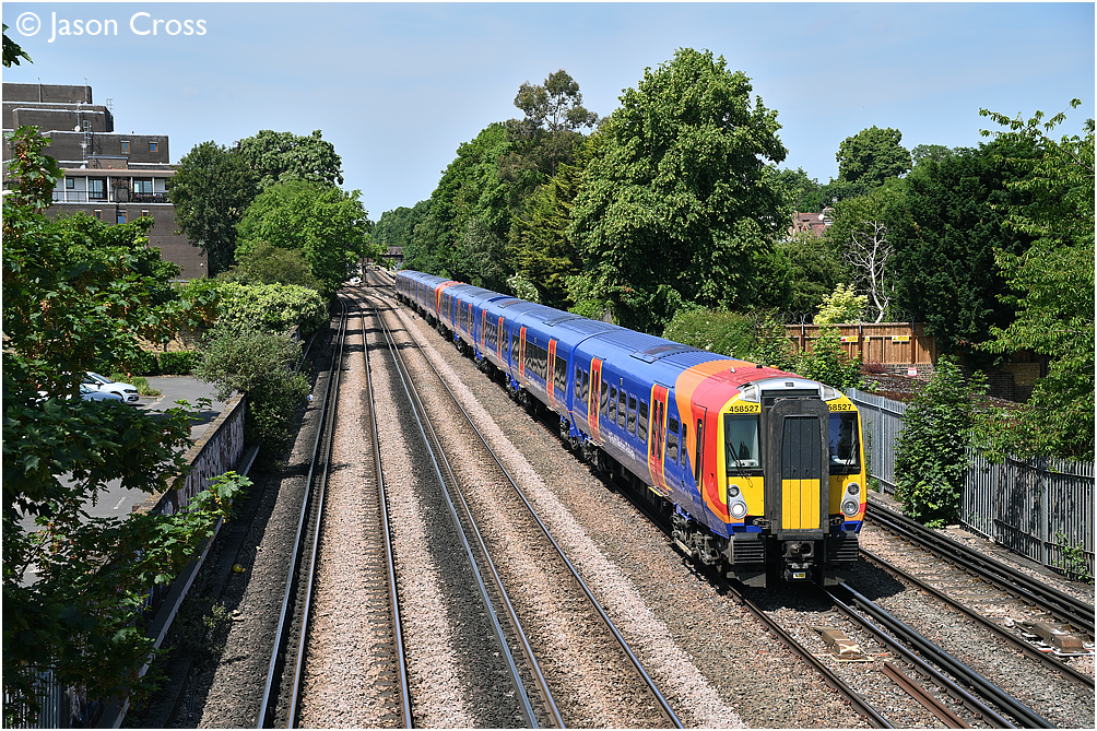 458527 and 458523 pull away from their Barnes station stop with the 2C30 1039 Reading to London Waterloo. Date: 15 June 2023 Manipulation Notes: None
