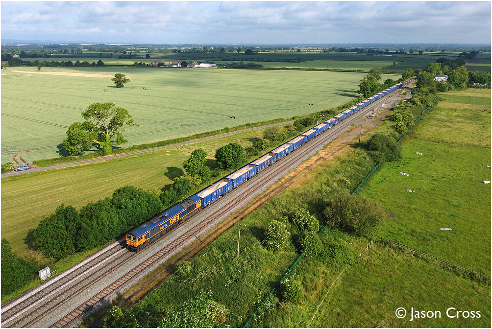 66774 passes Elford Loop with the 6G80 0423 Peak Forest Cemex to Small Heath Cemex stone train. Date: 19 June 2023 Manipulation Notes: None Photo taken from a drone