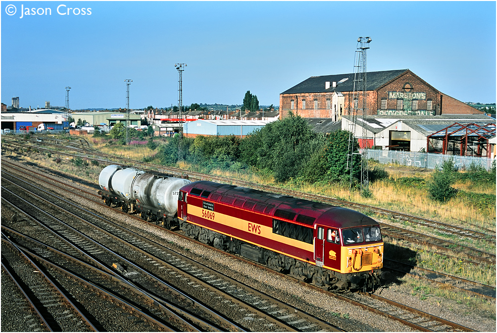 56069 pauses at Burton upon Trent with the 6P17 1111 Burton on Trent to Toton trip freight. Date: 16 August 2002 Manipulation Notes: None