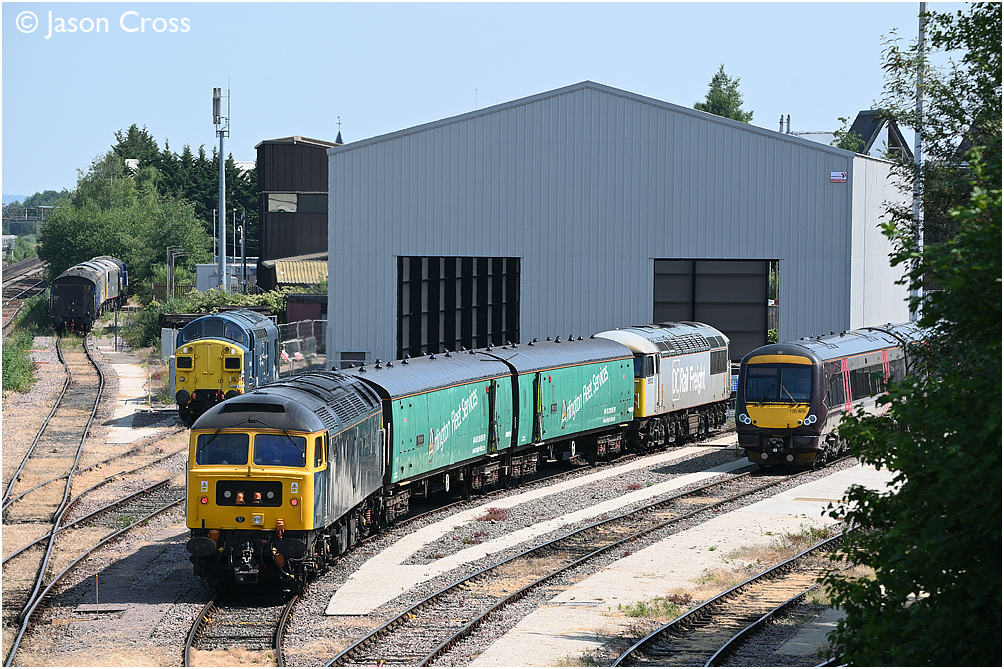 With a new shed as a backdrop, 47727 is coupled to some translator vehicles on Leicester Depot. Date: 22 June 2023 Manipulation Notes: None