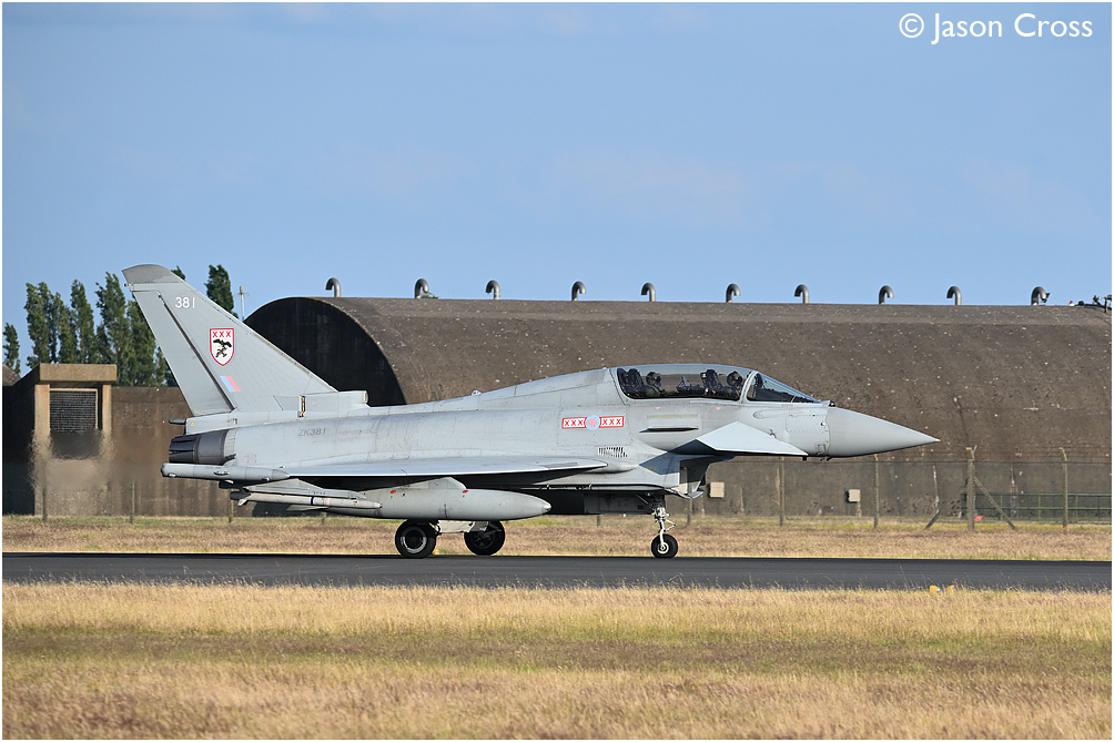 Royal Air Force Eurofighter Typhoon T3 ZK381 landing on runway 25 at RAF Coningsby. Date: 6 July 2023 Manipulation Notes: None