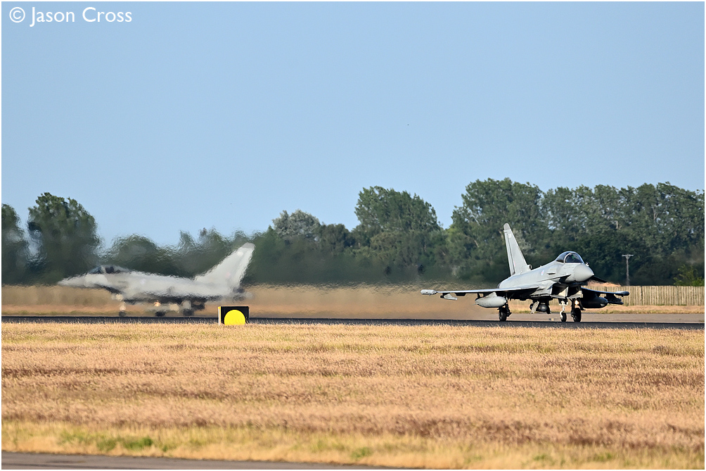 Royal Air Force Eurofighter Typhoon FGR4s ZK319 and ZK353 departing as RAZOR flight from runway 25 at RAF Coningsby. Date: 6 July 2023 Manipulation Notes: None