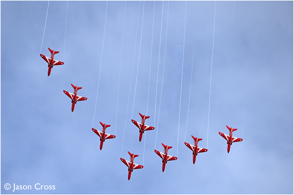Royal Air Force Aerobatic Team, the Red Arrows (Hawker Siddely / British Aerospace Hawk T1s). Royal International Air Tattoo (RIAT), RAF Fairford. Date: 16 July 2023 Manipulation Notes: None