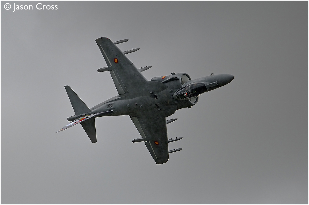 Spanish Navy, McDonnell Douglas EAV-8B Mattador II (Harrier) 01-916 performing its solo display in the pouring rain. Royal International Air Tattoo (RIAT), RAF Fairford. Date: 16 July 2023 Manipulation Notes: None