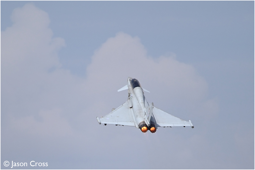 Royal Air Force Eurofighter Typhoon T3 ZK383 carrying 12 Squadron markings makes a performance departure. RAF Coningsby. Date: 20 July 2023 Manipulation Notes: None