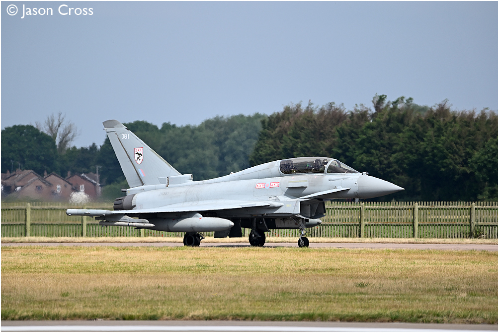 Royal Air Force Eurofighter Typhoon T3 ZK381 carrying 29 Squadron markings on the alpha taxiway. RAF Coningsby. Date: 20 July 2023 Manipulation Notes: None