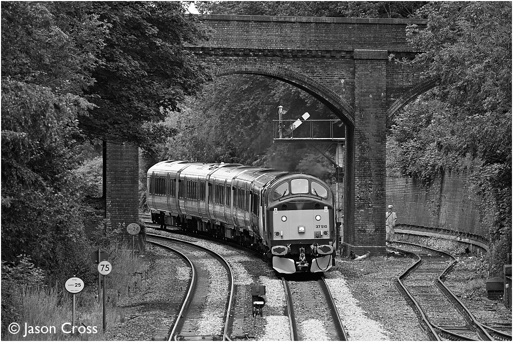 37510 hauls 720601 into Melton Mowbray running as a 5Q72 1004 Derby Litchurch Lane to Wembley Inter City Depot stock move. Date: 25 July 2023 Manipulation Notes: None